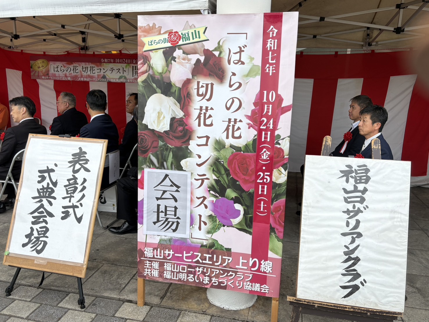 福山ローザリアンクラブ 主催 令和7年 ばらの花 切りばらコンテストR7/10/25 令和7.年10月24日(金)〜25日(土)、山陽自動車道福山サービスエリア上り線にて、福山ローザリアンクラブ主催のば『はらの花 切りばらコンテスト』が開催されました。25日の表彰式には、ばらオーナー会会長としてお招きいただきました。ばら愛好家の方々の丹精こめて作られた数々の作品、ご受賞、誠におめでとうございます。これからも素晴らしい作品を生み出していかれることをお祈り申し上げます。福山ローザリアンクラブ、また関係者の皆さま、大変お疲れ様でしたm(._.)m