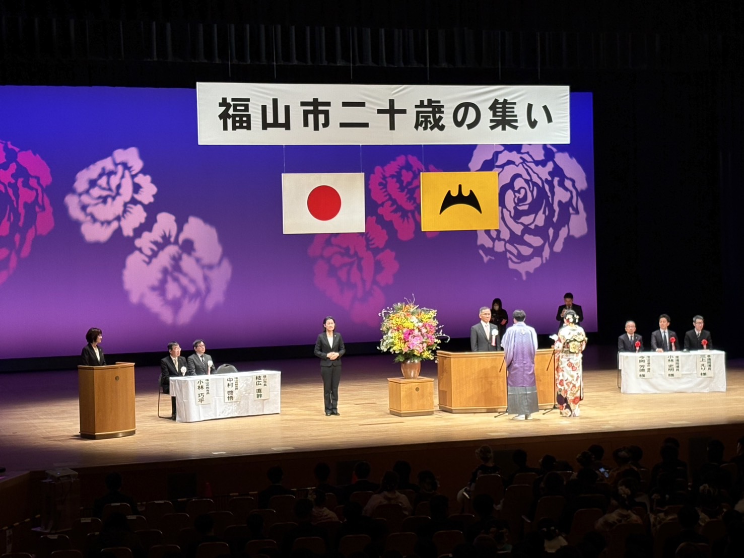 令和8年1月11日(日)、ふくやま芸術文化ホールリーデンローズにおいて、今年も2026年(令和8年)福山市二十歳の集いが盛大に開催され、来賓として参列しました。福山市「二十歳の集い」に、福山市議会議員として来賓で参加しました。今年は4,301名の皆さんが二十歳を迎えられました。代表者2名による誓いの言葉」では、家族や地域への感謝と、これからの将来に向けた誓いの言葉をいただきました。二十歳を迎えられた皆さま、本当におめでとうございます。皆さまが夢と希望に満ちあふれ、明るい未来へ向かって羽ばたいていただけるよう願っています(*^^*)。