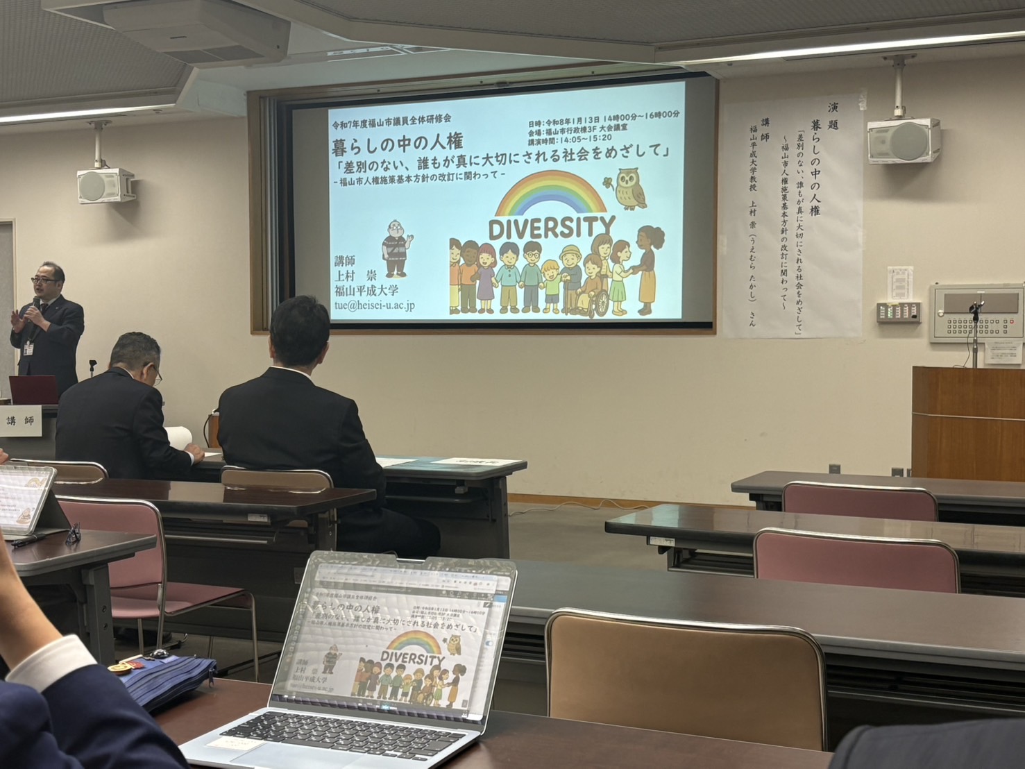 令和8年1月13日(火)、今年度も市役所本庁舎3階大会議室にて、2025年度(令和7年度)議員全体研修会が開催され、出席しました。福山平成大学の上村崇氏が務められ『暮らしの中の人権〜差別のない、誰もが
